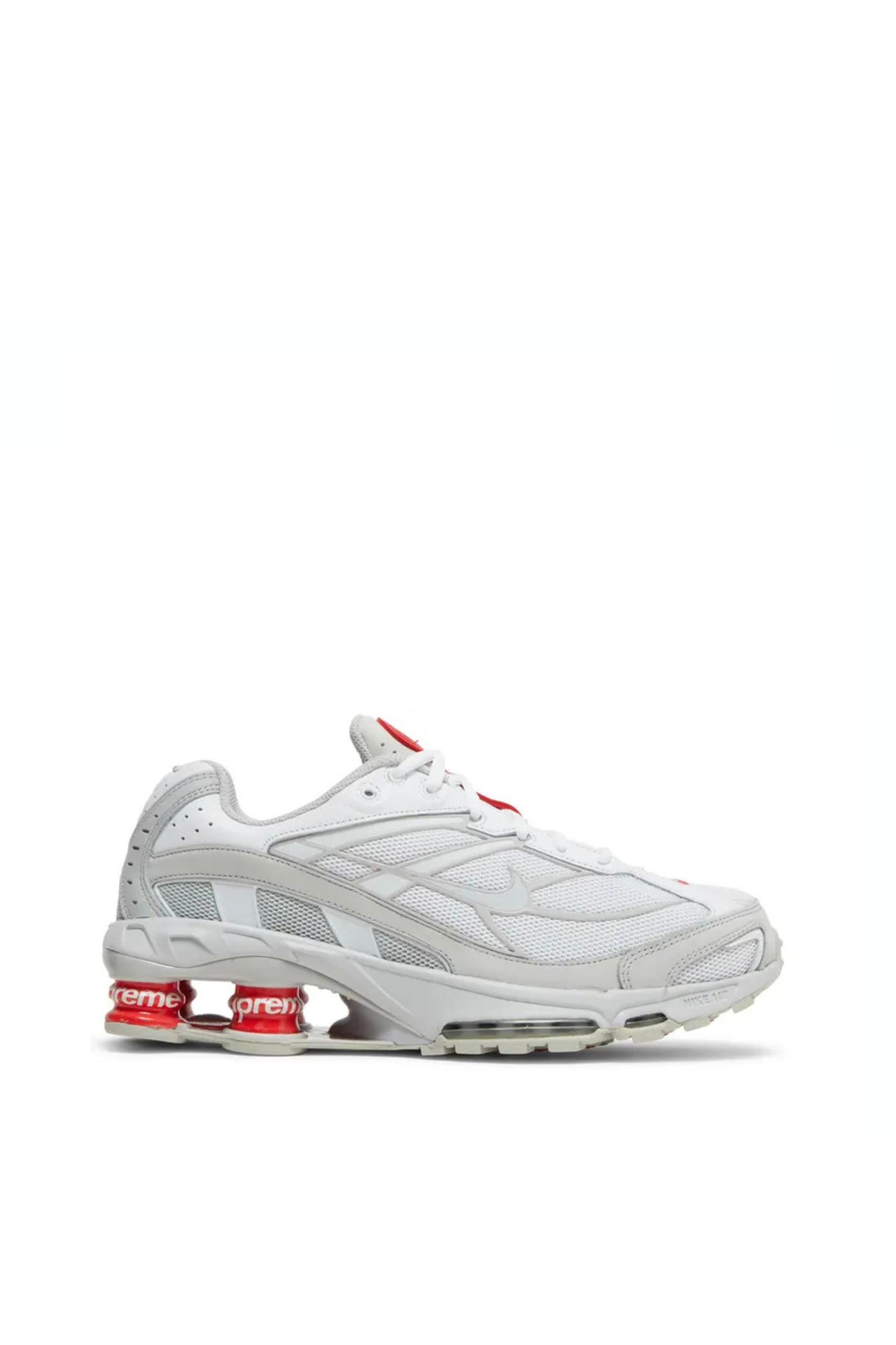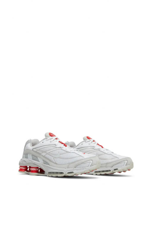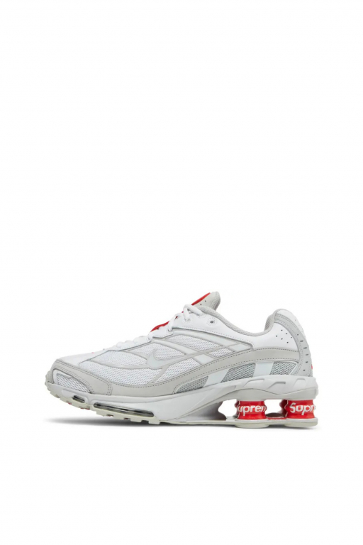 Nike Supreme Shox — це вибухова комбінація культового дизайну та безпомилкового вуличного стилю. Білосніжний верх із сітки та гладких вставок створює легкий, динамічний силует, а фірмові червоні акценти Supreme додають моделі характеру та ексклюзивності. Елегантний Swoosh плавно вписується в панелі, підкреслюючи преміальну естетику.